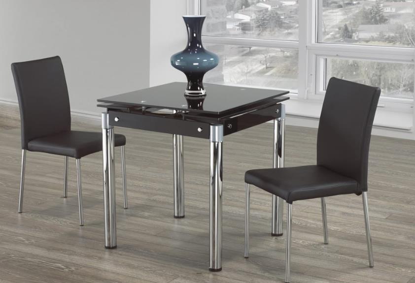 There’s no need to be formal with this dinette set, this sleek dining set has a black glass top with chrome-accented legs and extendable leafs on both sides, which make it accessible for any space.Read More