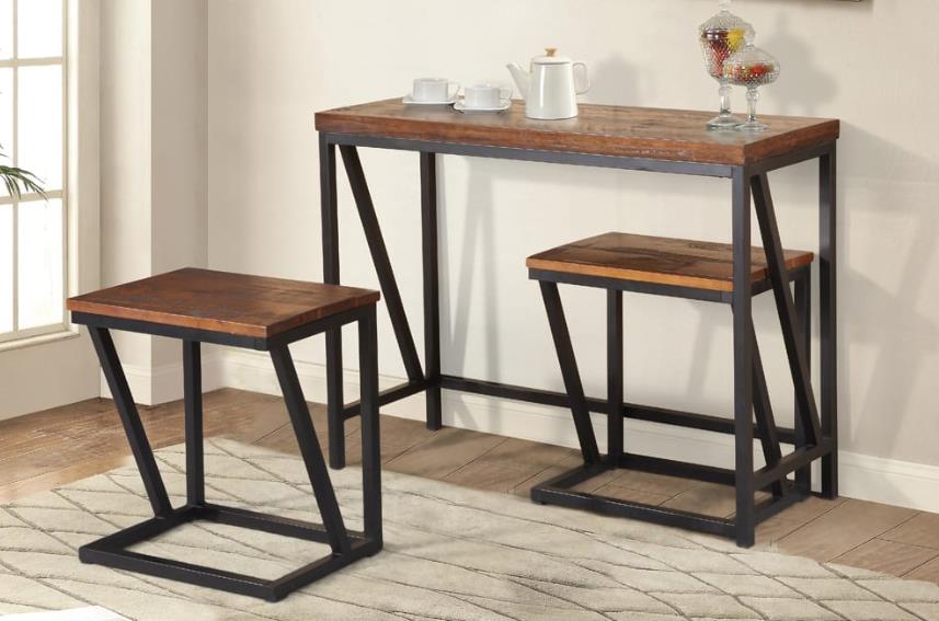 The ultimate small space solution- this high counter-style table with matching stools includes a distressed, walnut finish, and a solid wood top with strong support metal legs. Seats tuck easily under the table for convenience.Read More
