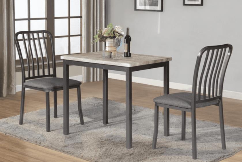 Enjoy this modern-looking dining set with a two-tone table design, and stylish chairs with a touch of industrial flair. Sturdy, and built to last, this set includes a light grey finish tabletop, with grey finish metal legs, and grey, linen-style fabric seating with matching grey finish metal legs.Read More