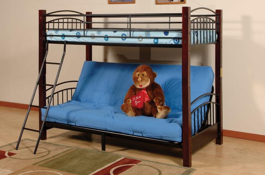 A futon below can be used as a sofa, or folded down to a full size bed.