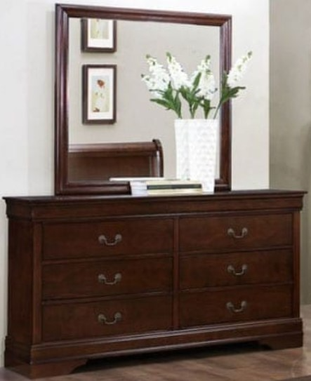 Elevate your home with the Louis Philippe Dresser with Mirror. With its semi-gloss dark cherry finish, this captivating piece exudes timeless allure. Crafted with precision and showcasing the beauty of wood veneer, this dresser features six spacious drawers to keep your clothes organized and easily accessible.Read More